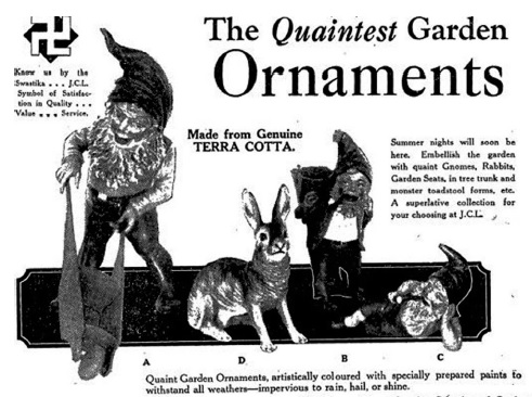 The first advertisements for garden gnomes in New Zealand appeared only in 1931. While today gnomes are generally considered ‘cheap’, the individuals advertised in 1930s New Zealand were anything but, and they were reported as residing in the homes of prominent, wealthy individuals. This was markedly different from England in the 1930s, by which time garden gnomes had lost much of their privileged status, and had moved from the stately homes onto suburban lawns or amusement parks.