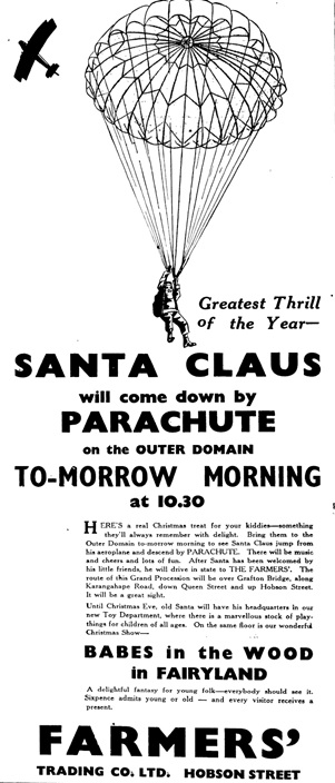 In early November 1937, Auckland City Council granted a request from Farmers Trading Company Ltd to allow the landing of a parachutist, attired as Father Christmas, in the Domain. Nevertheless, as the Auckland Star noted, it was “reported to the council” – though it is unclear from the article, by whom – that it actually had no power to stop anyone landing on the Domain anyway.[ii] Advertisements began appearing in newspapers soon after; “Real life Santa Claus will jump from his ‘plane and come down by parachute”. “When will he be here?” the advertisements asked, and perhaps more ominously in hindsight, “Where will he land?”.