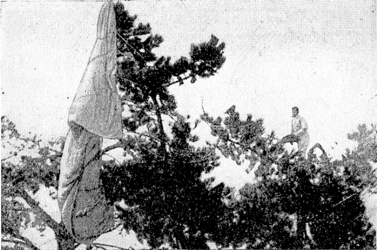 Widely reported in the papers, a number of incidents occurred during Sellars’ career besides the Wintergardens miss and near drownings. For example, in February 1936, making his first descent at a pageant at the Hood aerodrome, Masterton, Sellars landed in a tree. Not able to avoid it, he landed on the top branch, fully ninety feet above the ground. It was reported that he was fortunately not injured, but it took him a fair amount of time and patience to untangle the parachute. Sellars was said to have been given a “rousing sendoff when he gamely went aloft for his second jump”, but on this occasion he also missed the landing site and came to settle in an orchard a few hundred yards from the hangar.[xvi]