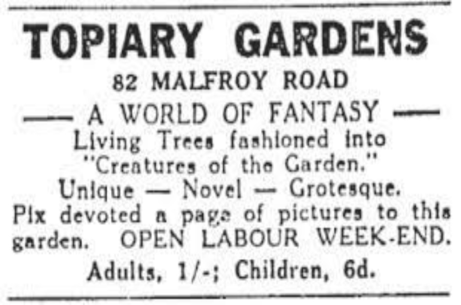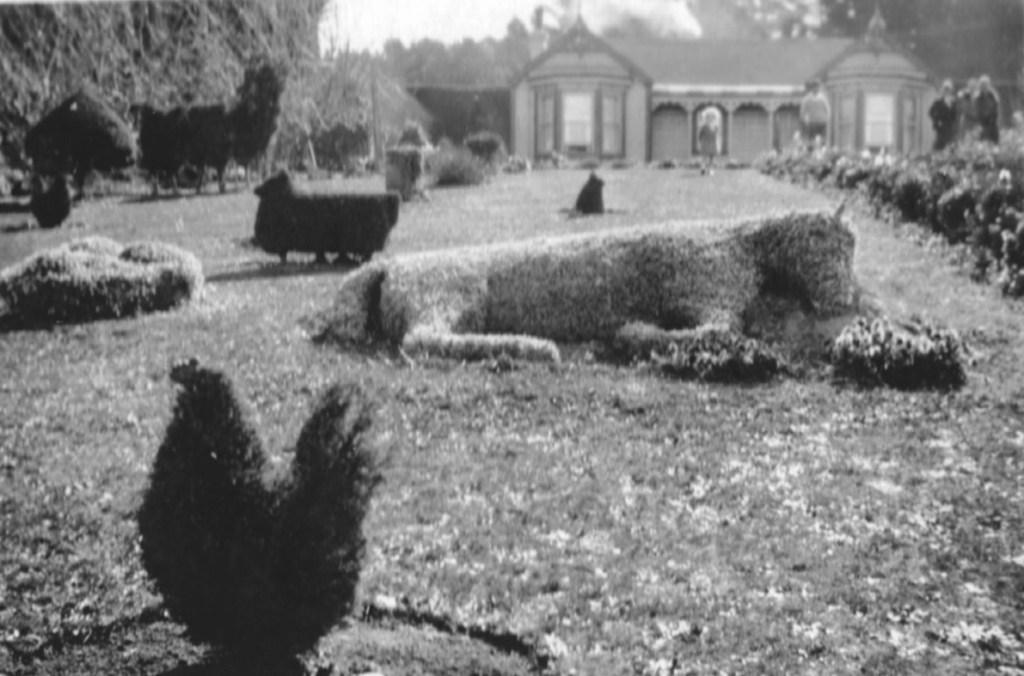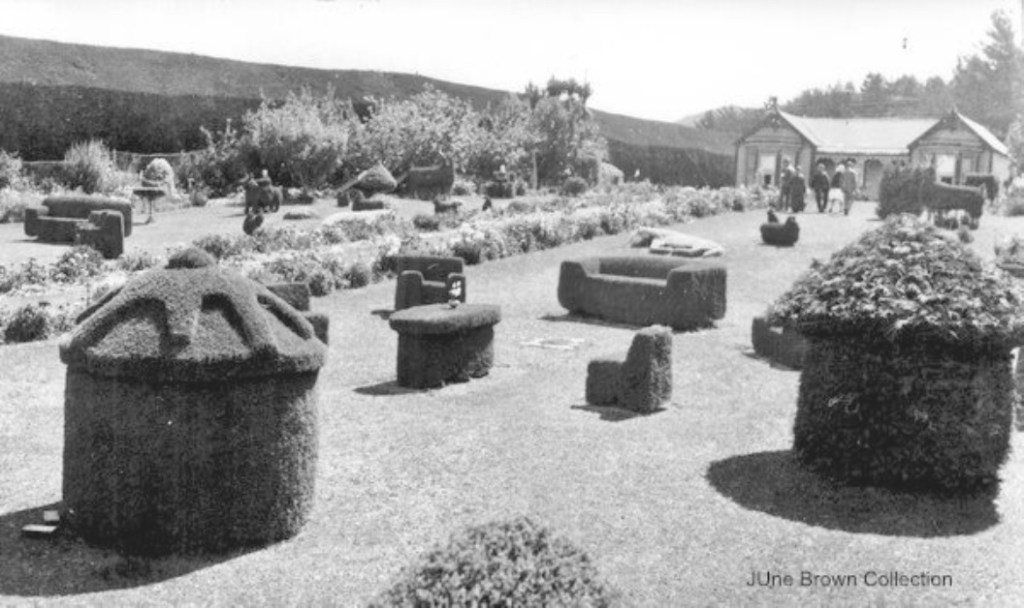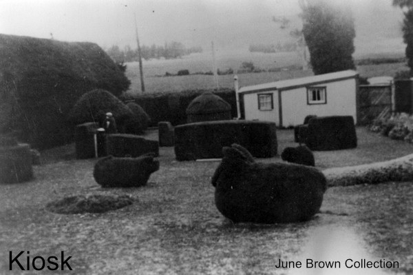 As time passed, John’s Topiary Garden attracted passers-by. People stopped their cars to look and wonder at the sight, and not before long people were invited in to walk around the garden to chat with John. The garden became so popular, it was decided to allow the hedge out the front to grow higher to restrict the view from the road. Then a small entry fee was charged, and a kiosk was built to serve tea and scones. Lesley Cooper (a grandchild of John’s), who lived next door to the garden, ran the kiosk at the weekends. A convenience was also built on the section next door to the right, accessed through a tunnel in the hedge.