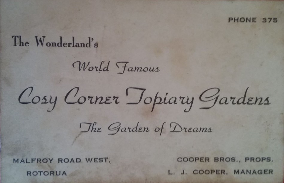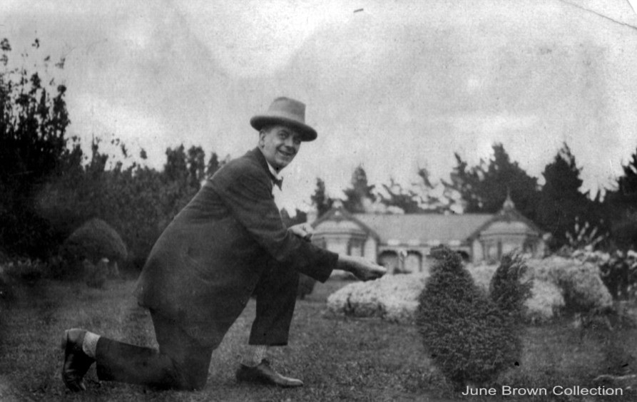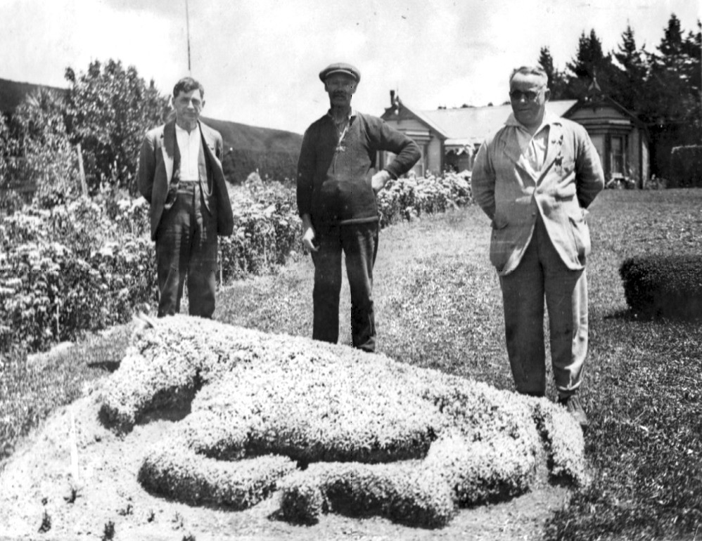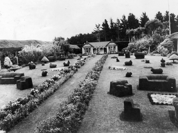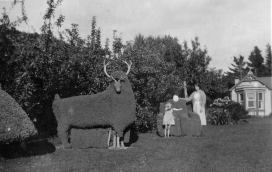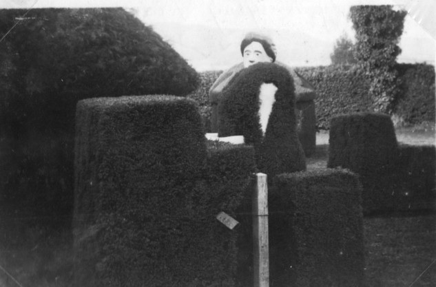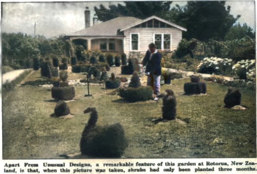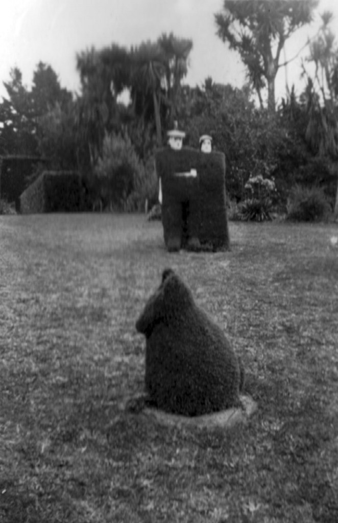 It would appear there were stock photographs of the garden sold to members of the public and family. Most relatives have at least one of these photographs. Milton Ranger (adopted into John’s brother’s family) appears to have been responsible for many of these photographs. There were also many other photographs taken of the visitors, either sitting on topiary chairs upon a sheet of plywood, or feeding a topiary hen. One particular photograph in the garden had as its subject, John Cooper accompanied by Lady Bledisloe, wife of the Governor-General.