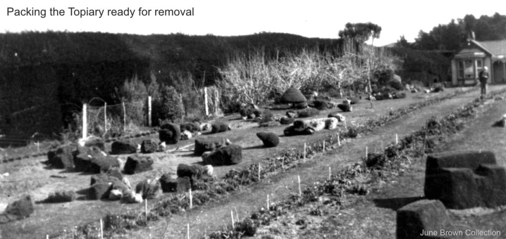 In 1938 it was decided to move the Topiary to Malfroy Rd, Rotorua. It was reasoned; while they were hosting a steady stream of interested visitors to the Topiary in the Wairarapa backwater, they were likely to gain many more visitors if they shifted everything to the tourism centre of Rotorua. So the Topiary was dug up, with roots and earth, bound in large sacks, and sent to Rotorua via truck, then rail.