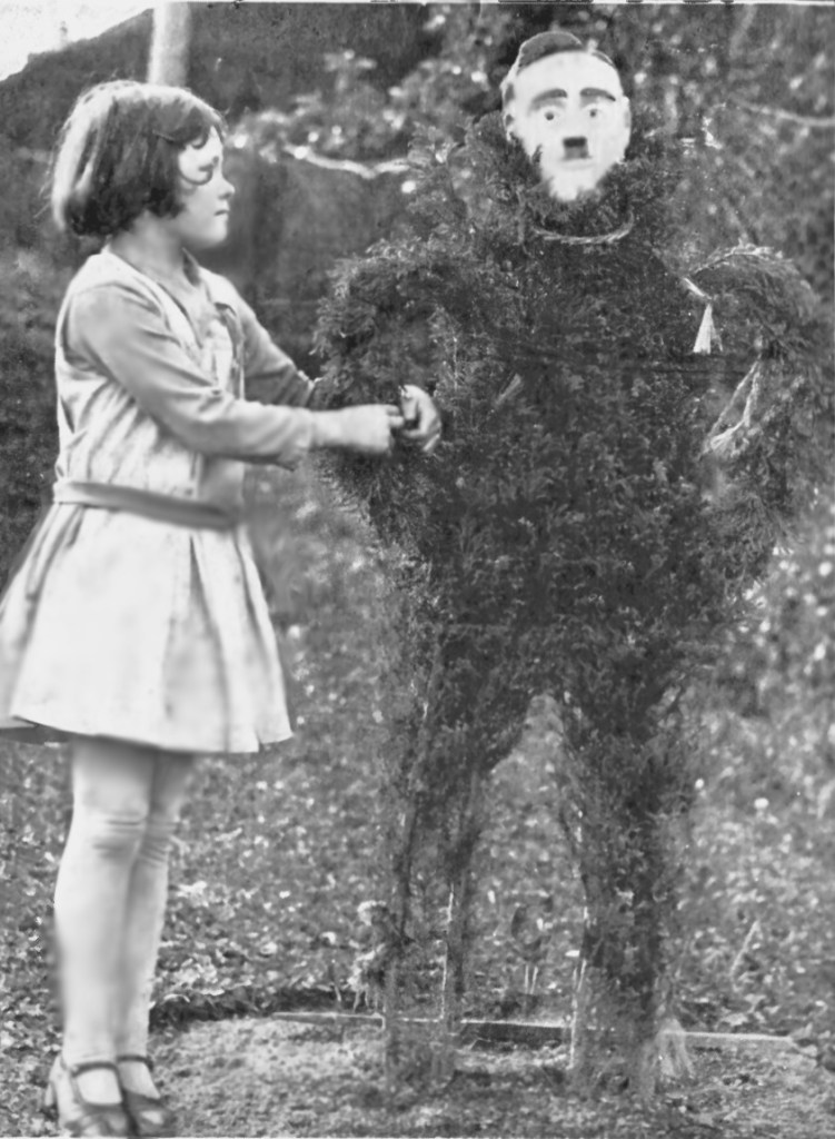 At that time in his garden, either side of the path, was a flower bed containing what appears to be a type of ground cover. Maybe the shape of it reminded John of a resting horse (Pareidolia as discussed above). By 1930 the shape of the horse was distinct, the head having been raised as well, and with its mirror image on the other side of the path. Here is where I believe John Cooper’s Topiary motivation began. Then, coupled with the tedium of edge trimming, some Pareidolia, and a need to be busy and active in his winter years, the Topiary began, and indeed it took off.