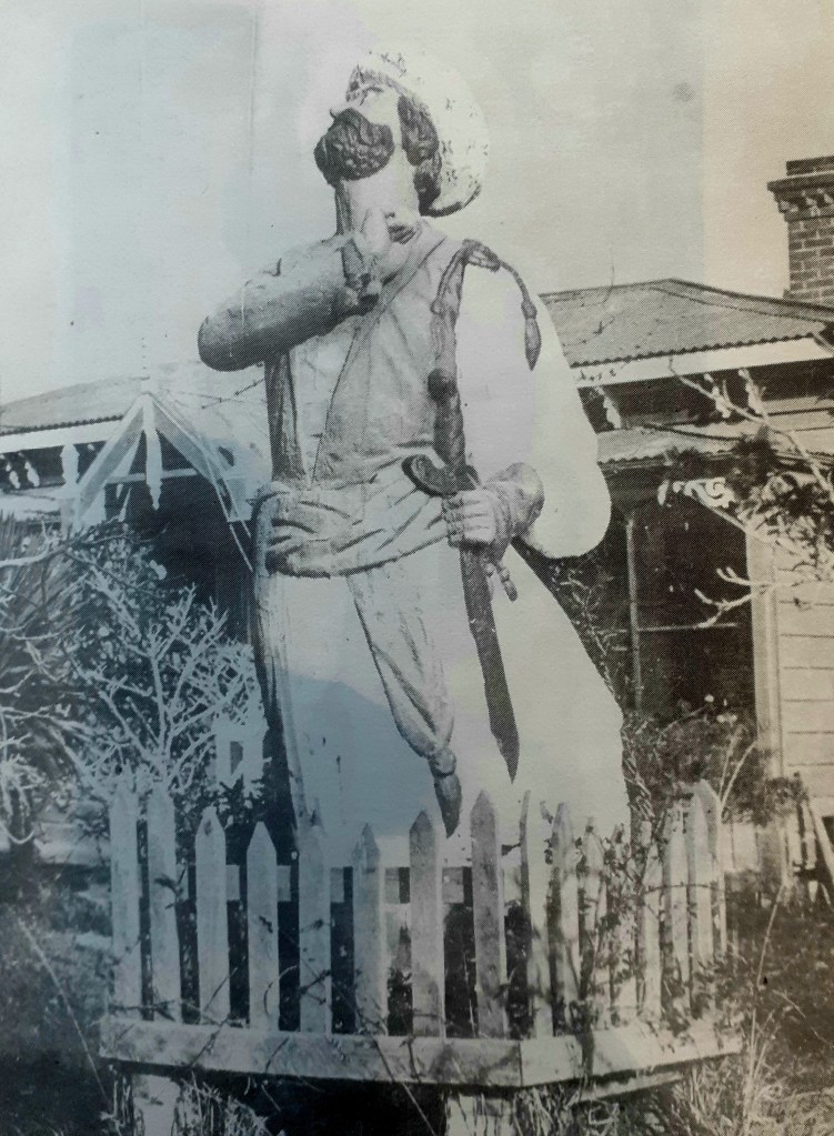 “In the centre of a garden plot in front of a cottage at Foxton is a brightly painted piece of well executed statuary. It is the figure enlarged to far more than life size of an Indian Rajah, dressed in full regalia, with scimitar, and hand uplifted in a threatening attitude. The legs are cut away, but the carving from the knees upwards, and the fierce expression on the black-bearded face of the Eastern potentate, are admirably executed”.